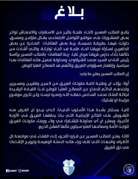 الأمر الذي دفع بإدارة نادي اتحاد طنجة، لإصدار بيان رسمي. ترفض من خلاله التشكيك في وطنية مكوناته. عقب انتشار مقطع فيديو يظهر الرئيس إلى جانب عدد من المنخرطين وهم يرددون شعار “عاشت الجزائر”.