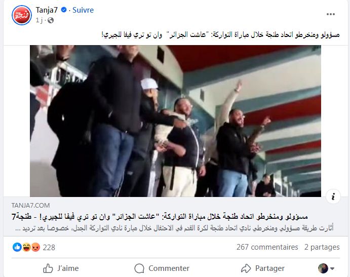 أحدثت عبارة “وان تو ثري فيفا لالجيري” زلزالا في الوسط المغربي، بعدما تم ترديدها بملعب “سانية الرمال” بتطوان، بمناسبة لقاء اتحاد طنجة وواتحاد تواركة يوم الخميس الماضي.
