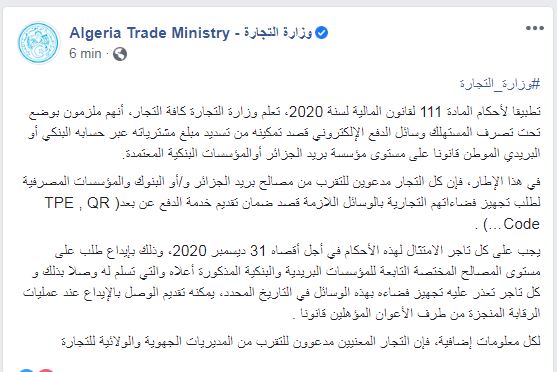وقالت الوزارة في بيان لها: تطبيقا لأحكام المادة 111 لقانون المالية لسنة 2020، تعلم وزارة التجارة كافة التجار، أنهم ملزمون بوضع تحت تصرف المستهلك وسائل الدفع الإلكتروني قصد تمكينه من تسديد مبلغ مشترياته عبر حسابه البنكي أو البريدي الموطن قانونا على مستوى مؤسسة بريد الجزائر أوالمؤسسات البنكية المعتمدة.