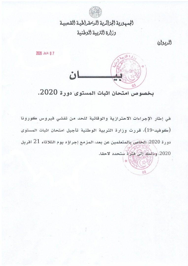 أعلنت وزارة التربية الوطنية تأجيل إمتحان إثبات المستوى المتعلق بدورة 2020.