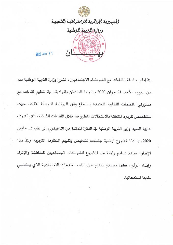 تشرع اليوم الاحد وزارة التربية الوطنية، في تنظيم لقاءاتها مع مسؤولي المنظمات النقابية المعتمدة بالقطاع.
