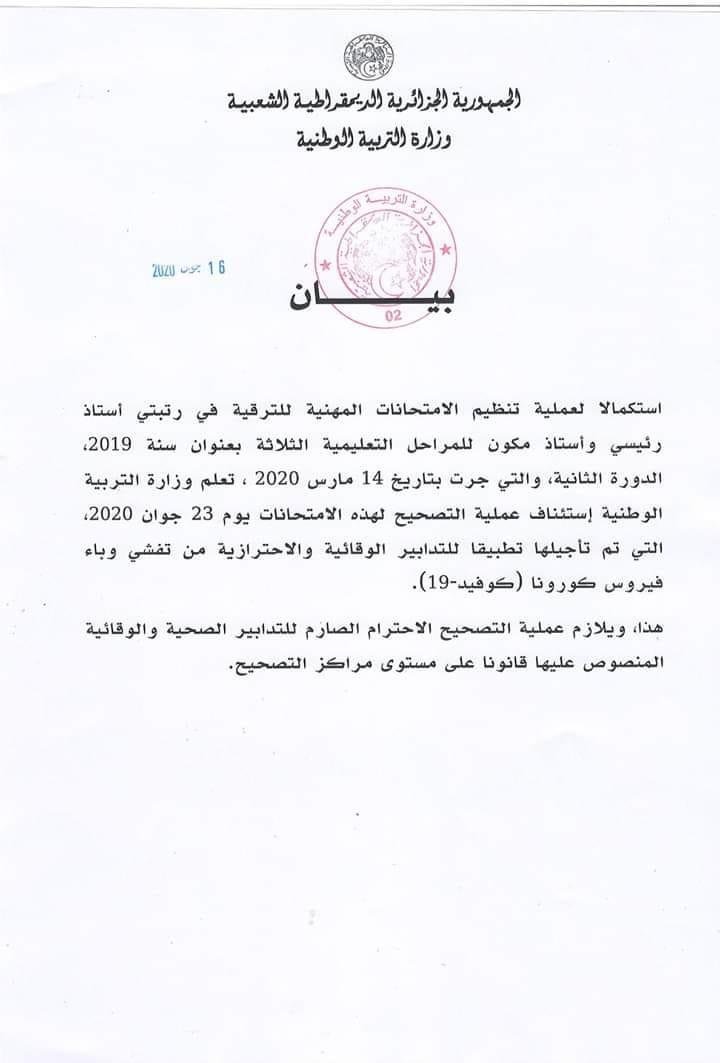 أعلنت وزارة التربية عن استئناف عملية تصحيح أوراق امتحانات الترقية برتبتي استاذ رئيسي وأستاذ مكون للمراحل التعليمية الثلاثة.