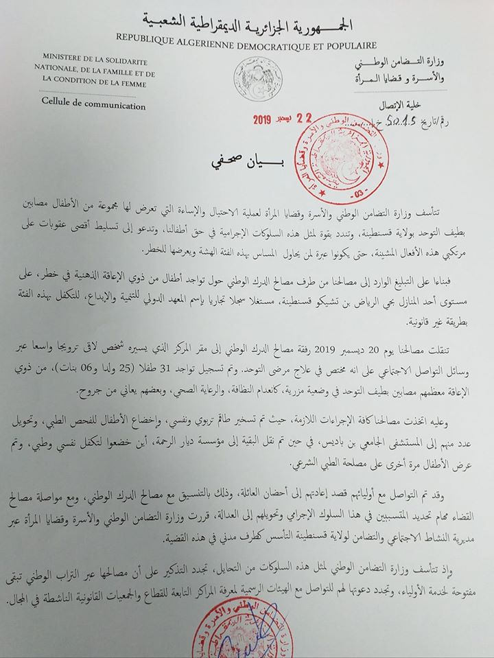 وفي بيان لها قالت وزارة التضامن الوطني أن مصالحها اتخذت كل التدابير للتكفل الصحي والنفسي مع تسخير طاقم نفسي وتربوي، كما تم نقل عدد منهم الى المستشفى الجامعي أبن باديس.