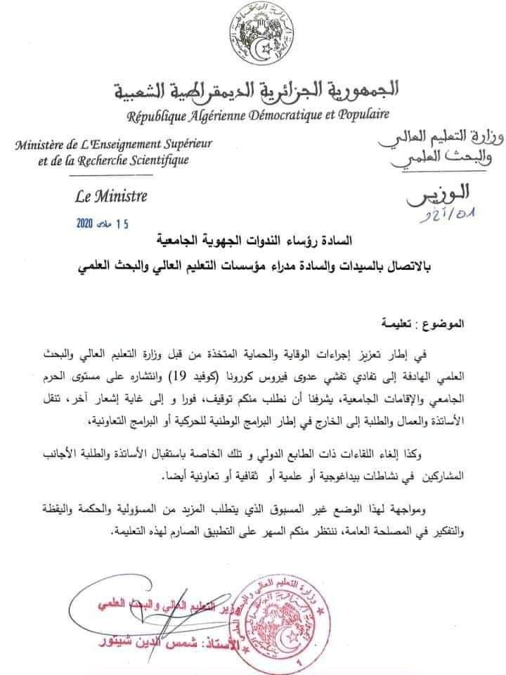 وجاء في تعليمة للوزارة: “يشرفنا أن نطلب منكم توقيف فورا وإلى غاية إشعار آخر، تنقل الأساتذة والطلبة إلى الخارج، في إطار البرامج الوطنية للحركية أو البرامج التعاونية”.