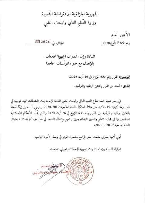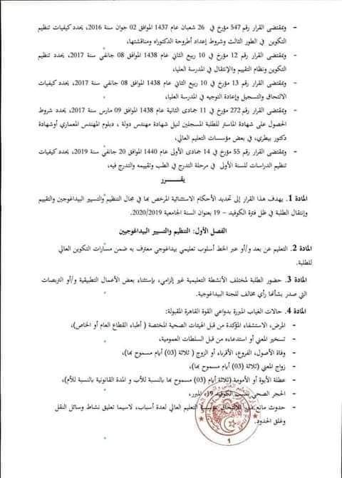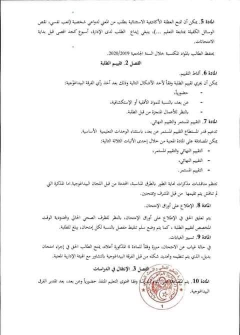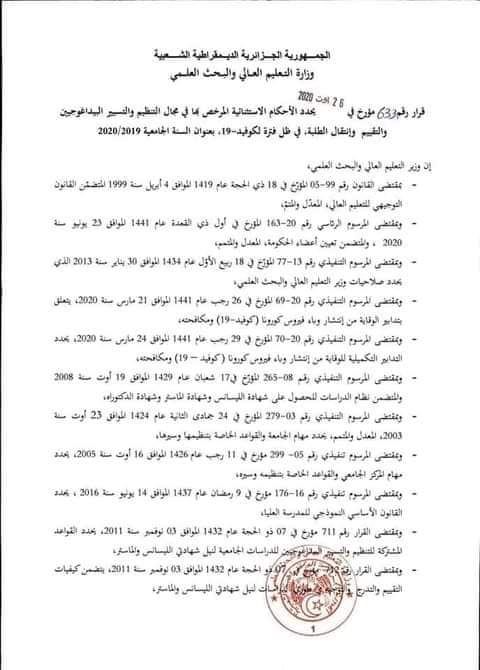 حددت وزارة التعليم العالي والبحث العلمي الأحكام الاستثنائية المرخص بها في مجال التسيير والتنظيم البيداغوجيين والتقييم و انتقال الطلبة في ظل جائحة كورونا برسم السنة الجامعية 2019-2020.