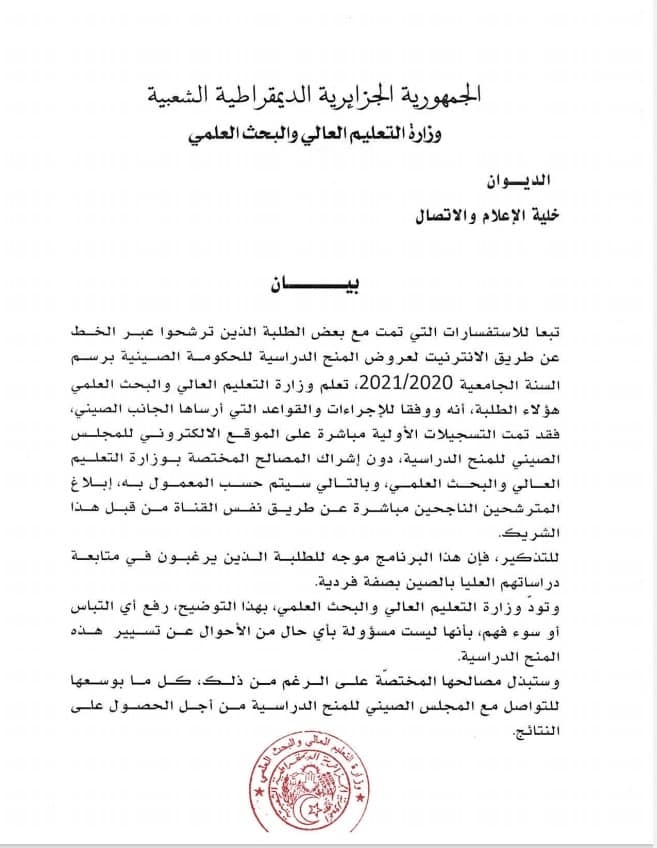اصدرت وزارة التعليم العالي والبحث العلمي، بيانا توضيحات حول الطلبة المترشحين المنح الدراسية للحكومة الصينية برسم السنة الجامعية 2021/2020.