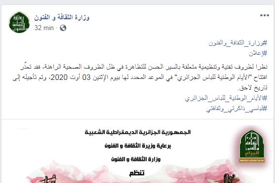 وقالت الوزارة في بيان لها: نظرا لظروف تقنية وتنظيمية متعلقة بالسير الحسن للتظاهرة في ظل الظروف الصحية الراهنة، فقد تعذّر افتتاح “الأيام الوطنية للباس الجزائري” في الموعد المحدد لها بيوم الإثنين 03 أوت 2020، وتم تأجيله إلى تاريخ لاحق.