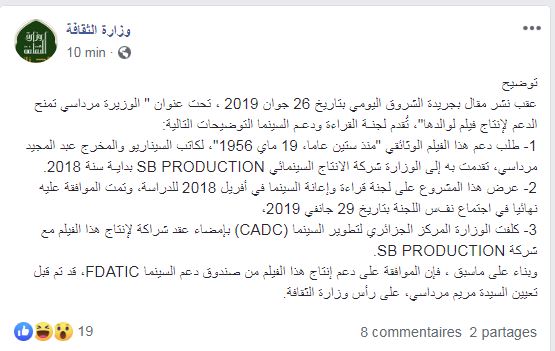 اوضحت وزارة الثقافة ما يتداول من اخبار حول دعم إنتاج فيلم لوالد الوزيرة مرداسي.
