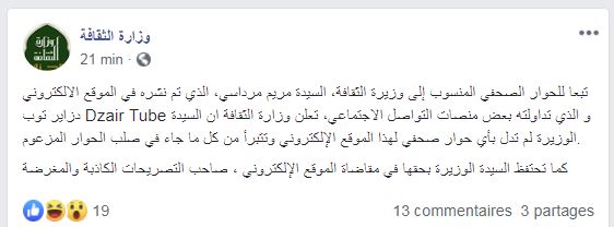 ونشر الوزارة على صفحتها الرسمية في فايسبوك انه :”تبعا للحوار الصحفي المنسوب إلى وزيرة الثقافة، السيدة مريم مرداسي، الذي تم نشره في الموقع الالكتروني دزاير توب Dzair Tube و الذي تداولته بعض منصات التواصل الاجتماعي.