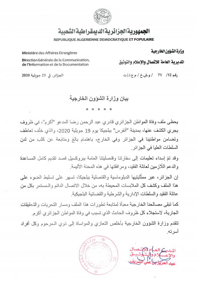 أصدرت وزارة الخارجية بيانا حول قضية وفاة الجزائري عبد الرحمن قادري المدعو أكرم في بلجيكا.
