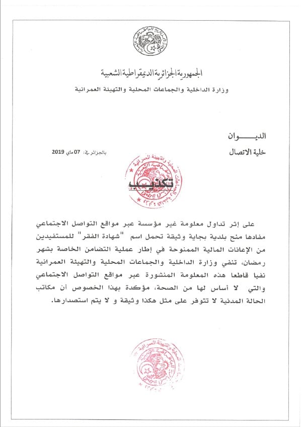 للإشارة، تم تداول اليوم عبر العديد من منصات التواصل الإجتماعي لوثيقة “شهادة الفقر”، حيث صدرت بمدينة بجاية، وكان لها الأثر البارز.