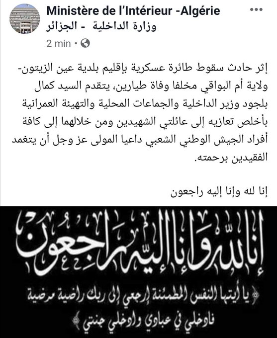 قدمت وزارة الداخلية والجماعات المحلية تعازيها لعائلتي الشهيدين اللذين توفيا إثر حادث سقوط الطائرة العسكرية بإقيلم بلدية عين الزيتون بولاية أم البواقي.