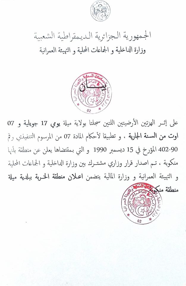 واعلنت وزارة الداخلية في بيان لها منطقة الخربية بولاية ميلة منطقة منكوبة بعد الهزتين الارضيتين التين ضربتا ولاية ميلة بتاريخ 17جويلية و7 اوت الجاري.