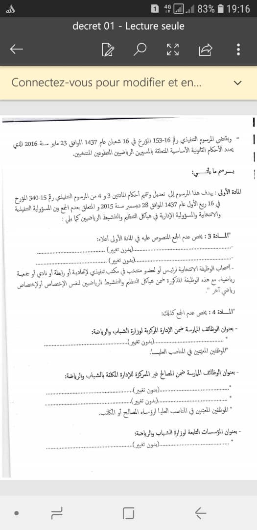 الوزارة قررت ترسيم عدم الجمع بين المسؤولية التنفيذية والانتخابية والمسؤولية الإدارية في هياكل التنظيم والتنشيط الرياضيين.