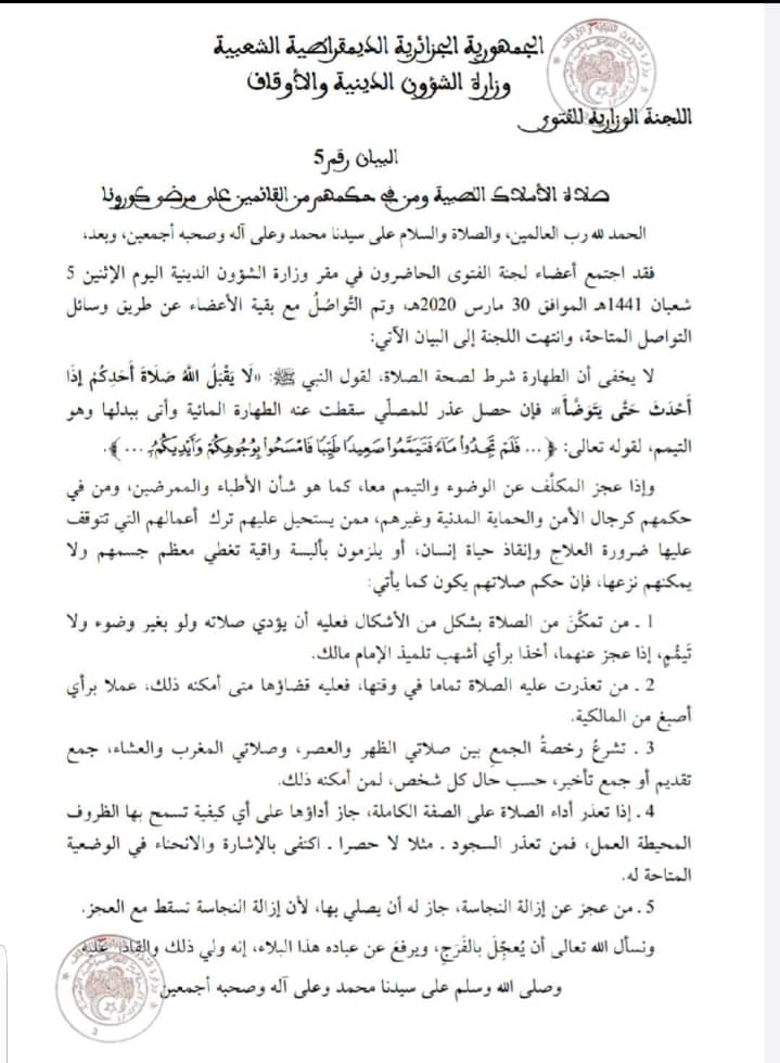 أصدرت وزارة الشؤون الدينية فتوى للأطباء والممرضين من أجل تأدية صلاتهم دون التخلي عنها.