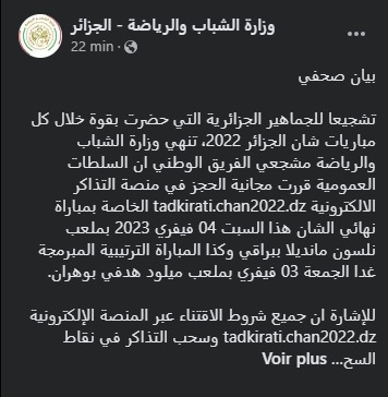وحسب بيان وزارة الشباب الرياضة، عبر صفحتها الرسمية، فإنه تقرر تحديد موعد إنطلاق عملية بيع تذاكر لقاء نهائي الشان بداية من الساعة 10 صباحا.