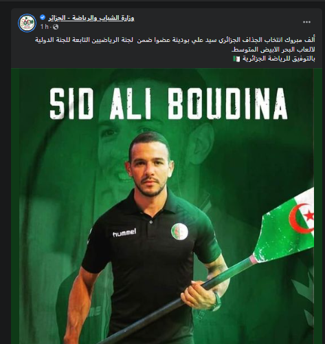 وكتبت الوزارة، اليوم الثلاثاء، عبر صفحتها الرسمية عبر الفايسبوك:”ألف مبروك انتخاب الجذاف الجزائري سيد علي بودينة عضوا ضمن لجنة الرياضيين التابعة للجنة الدولية لالعاب البحر الابيض المتوسط.