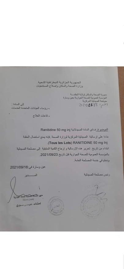 وجاء في مراسلة مديرية الصيدلية المركزية بوزارة الصحة التي تحمل رقم 1188 /2021، تم إرسالها إلى كل مديريات الصحة عبر الوطن، والتي بدورها قامت بتحويلها إلى كل مؤسسات الصحة العمومية والمؤسسات الاستشفائية الجامعية والمؤسسات الاستشفائية المتخصصة، تأمرهم بضرورة عدم استعمال حقن دواء “رانيتتدين” 50 ملغ، وألحّت المراسلة على عدم استعمال هذا الدواء وسحب جميع الحصص من هذا الدواء الموجودة على مستوى صيدليات هذه المؤسسات العمومية للصحة والعيادات الخاصة والمستشفيات والمستشفيات المتخصصة، وإرجاع الكمية المتبقية من هذا الدواء إلى مصلحة الصيدلية على مستوى هذه المؤسسات، قبل تاريخ 23 سبتمبر 2021، على أن تتم إعادتها إلى الصيدلية المركزية.