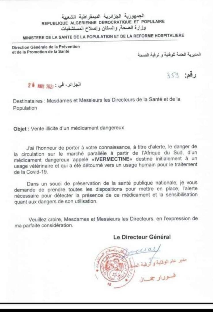 حذزت مديرية العامة للوقاية وترقية الصحة التابعة  لوزارة الصحة من التسويق الغير الشرعية لدواء إيفرمكتين ivermectine والمزعوم انه يعالج كوورنا.