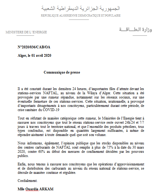كما أبلغت وزارة الطاقة الرأي العام أن المخزونات المتاحة لدى شركة نفطال، في محطات الوقود، ممتلئة بأكثر من 75 بالمائة بتاريخ الـ 30 مارس 2020.