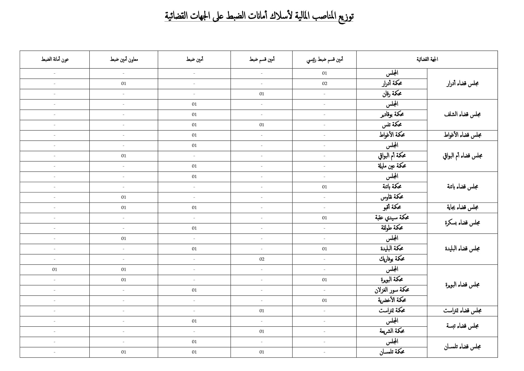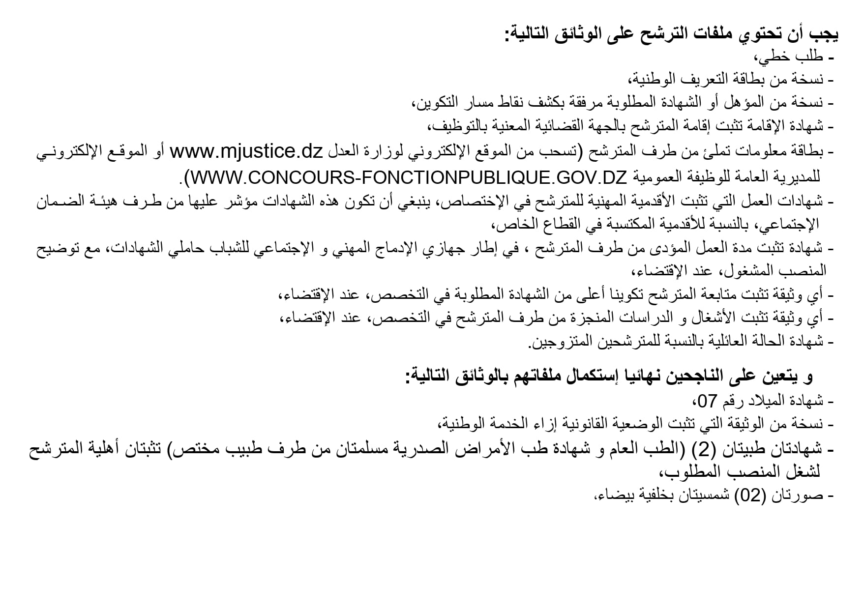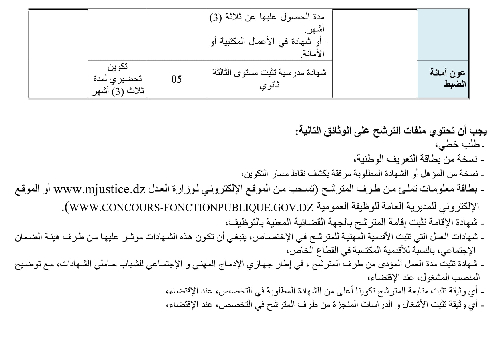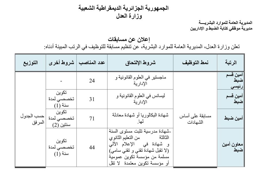 أعلن وزارة العدل عبر حسابها على الفيسبوك اليوم عن تنظيم مسابقة توظيف على أساس الشهادات للإلتحاق برتب أسلاك أمانات الضبط و الأسلاك المشتركة والتقنية.