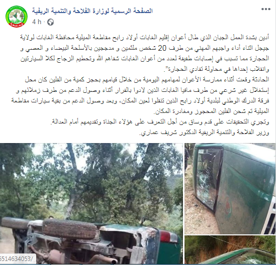 أدانت مساء أمس وزارة الفلاحة والتنمية الريفية بشدة العمل الجبان الذي طال أعوان إقليم الغابات بأولاد رابح في الميلية بجيجل.