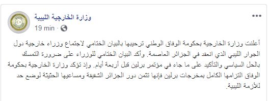 وأعلنت وزارة الخارجية بحكومة الوفاق الوطني في بيان لها على صفحتها الرسمية في فايسبوك، ترحيبها بالبيان الختامي لاجتماع وزراء خارجية دول الجوار الليبي الذي انعقد في الجزائر العاصمة.