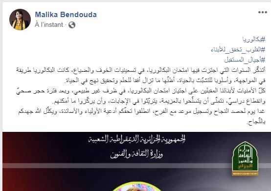 قالت وزارة الثقافة مليكة بن دوده أنها تذكرت السنوات التي اجتازت فيها امتحان البكالوريا، في تسعينيات الخوف والضياع.