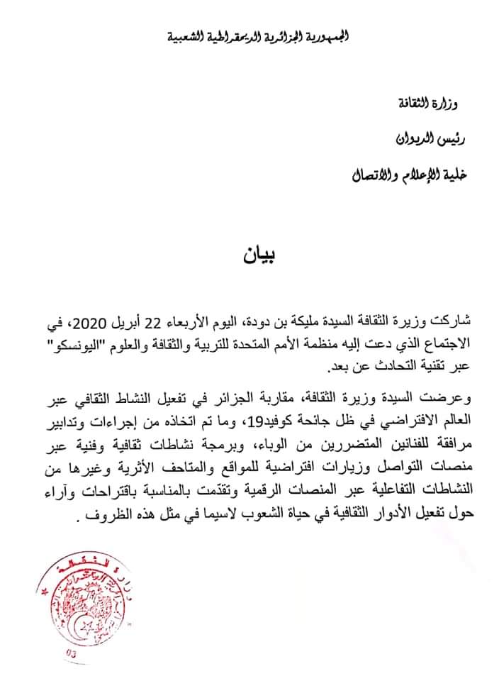 وخلال تدخلها عرضت على المنظمة مقاربة الجزائر في تفعيل النشاط الثقافي عن طريق العالم الإفتراضي في ظل انتشار جائحة كورونا.