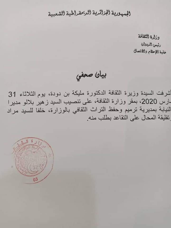 عينت وزيرة الثقافة مليكة بن دودة، أمس الثلاثاء، زهير بلالو، مديرا بالنيابة على رأس مديرية ترميم وحفظ التراث الثقافي.