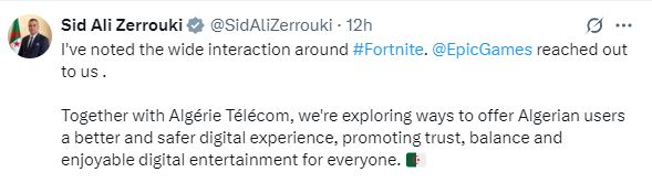 وكتب الوزير زروقي، في تغريدة له: ” لاحظتُ التفاعل الواسع حول لعبة فورتنايت.. تواصلت معنا شركة EpicGames. بالتعاون مع اتصالات الجزائر”.