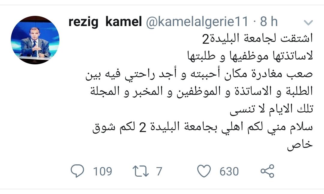وكتب رزيق في تغريدة له “اشتقت لجامعة البليدة 2 .. لأساتذتها، موظفيها وطلبتها”.