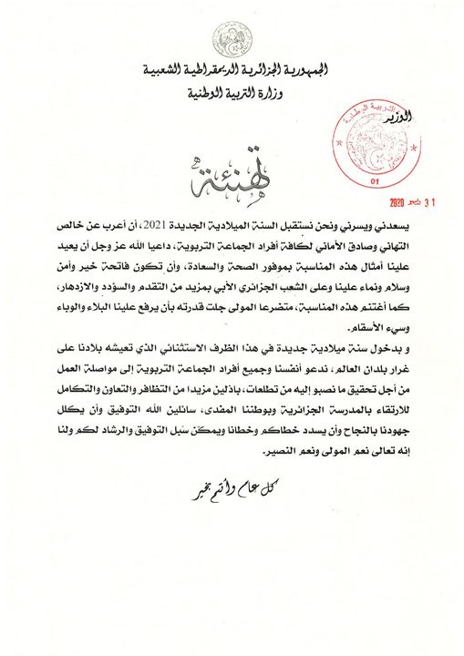 وزير التربية يهنىء الشعب الجزائري بمناسبة حلول العام الجديد 2021