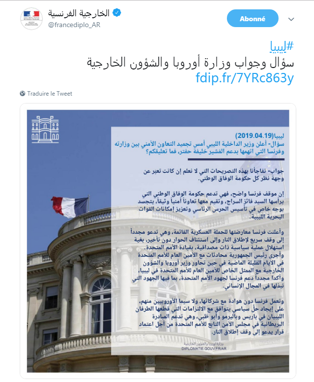 وقالت الخارجية الفرنسية اليوم في تغريدة لها على تويتر، ردا على تصريحات وزير الداخلية الليبي، إن فرنسا تدعم حكومة الوفاق