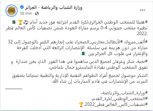 الحساب الرسمي لوزارة الشباب والرياضة على موقع التواصل الاجتماعي “فايسبوك” نشر رسالة التهنئة.