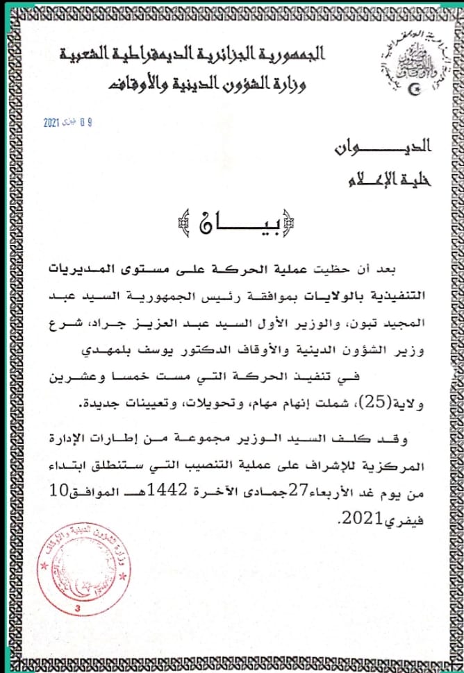 أجرى مساء اليوم الأربعاء وزير الشؤون الدينية والأوقاف يوسف بلمهدي حركة على مستوى المديريات التنفيذية بالولايات.