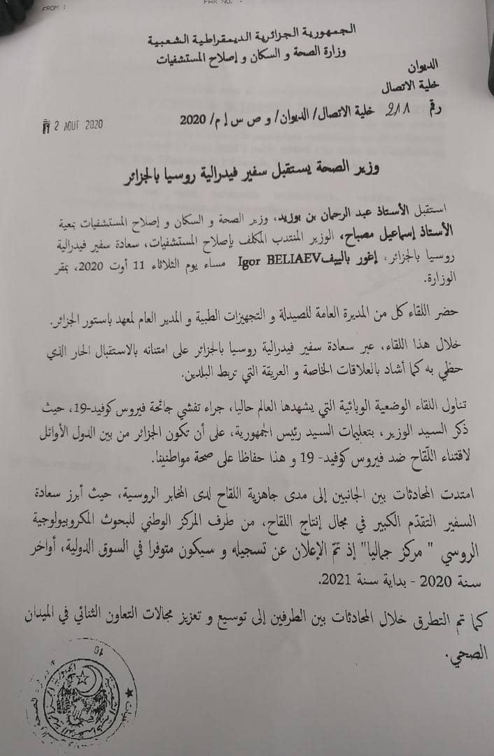 وزير الصحة يستقبل سفير فيدرالية روسيا بالجزائر