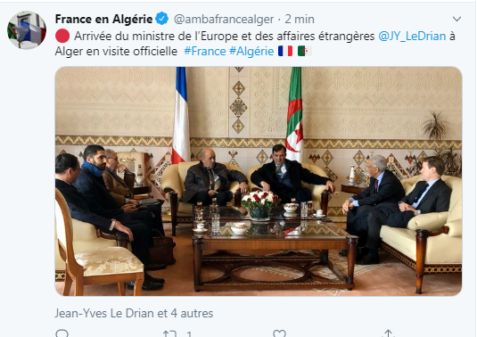 ونشرت، سفارة فرنسا بالجزائر عبر موقعها الرسمي، صورة وصول لودريان إلى الجزائر.