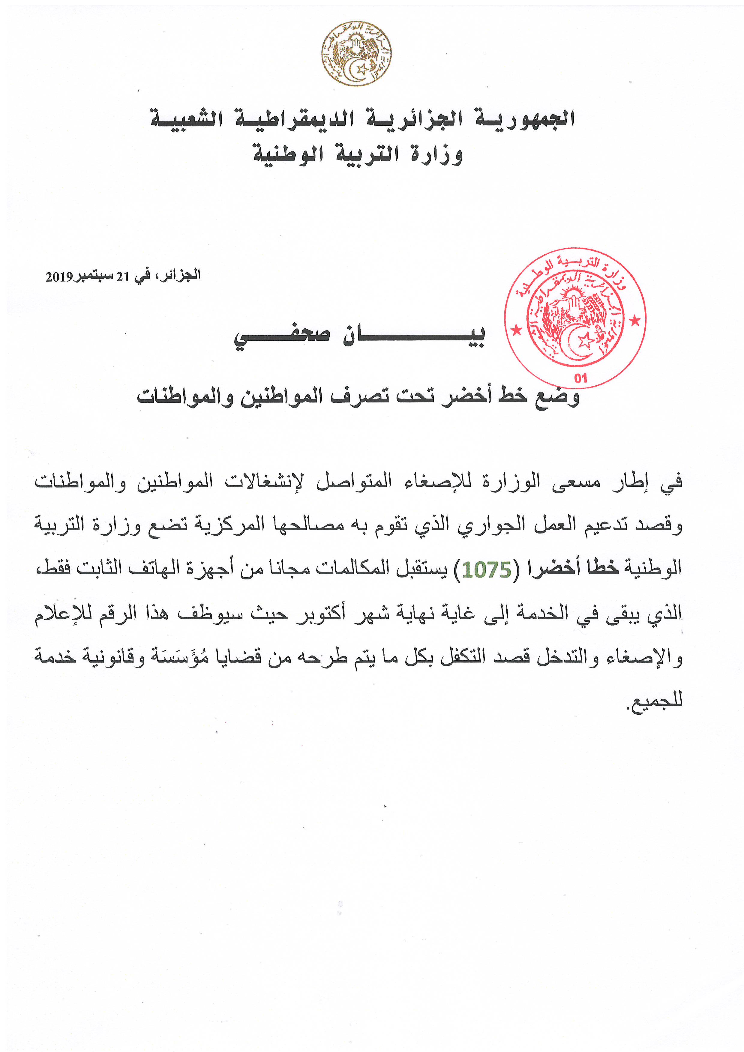 وضعت وزارة التربية الوطنية خط أخضر تحت تصرف أولياء التلاميذ ، قصدر الاصغاء لإنشغالاتهم.