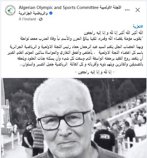 وتقدم رئيس اللجنة الأولمبية، عبد الرحمن حماد، باسمه وباسم كل أعضاء الهيئة الأولمبية، بتعازيه إلى عائلة فقيد الرياضة الجزائرية.