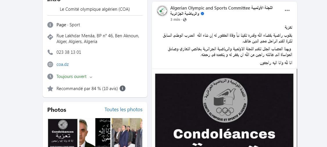 من جهتها، تقدمت اللجنة الأولمبية والرياضية الجزائرية بتعازيها. في وفاة المدرب الوطني السابق، محي الدين خالف، وذلك، في منشور عبر حسابها الرسمي على “فيسبوك”.