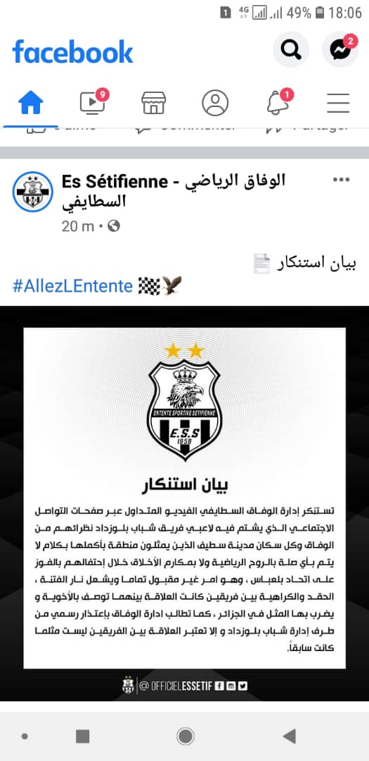 الوفاق السطايفي نشر بيانا رسميا استنكر فيه شتم بعض لاعبي السياربي للفريق السطايفي والمدينة بأكملها بكلمات لا تمت بصلة للروح الرياضية وكذا تُشعل نار الفتنة بين الناديين.