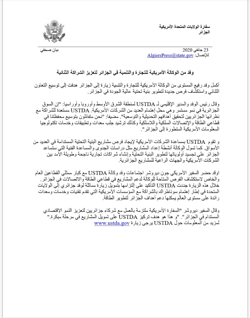 وأجرى الوفد الامريكي لقاءات مع العديد من ممثلي القطاعين الخاص و العمومي في الجزائر، حضرها السفير الامريكي جون ديروشر، الذي قال ان السفارة الامركية في الجزائر ملتزمة بالعمل مع شركائها في الجزائر لتعزيز النمو المستدام في الجزائر.