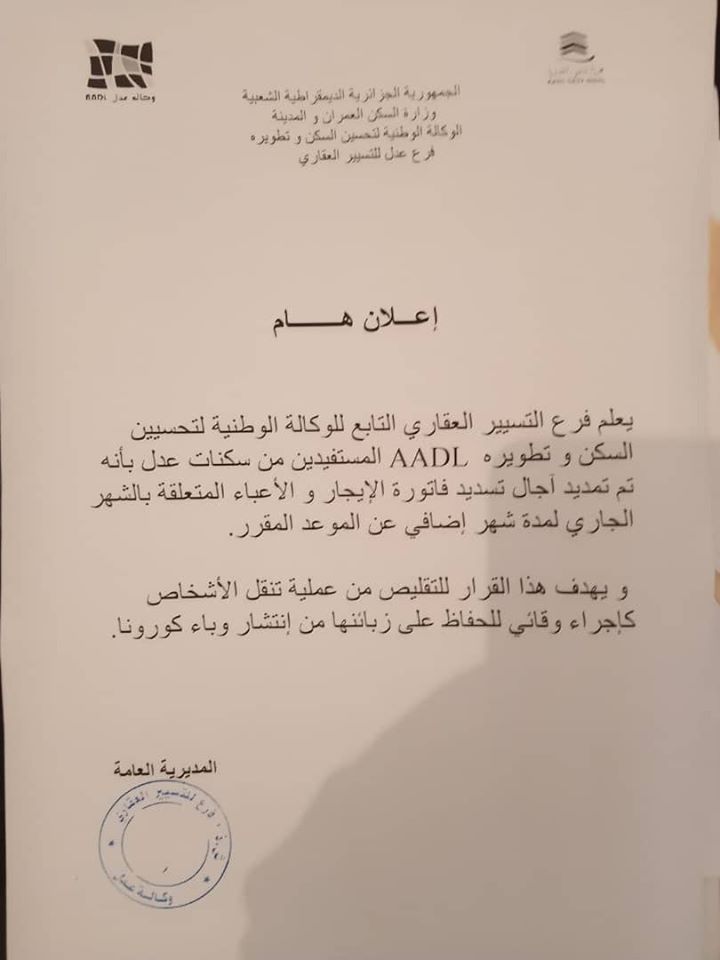وقال فرع التسيير العقاري التابع لـ”عدل” في بيان لها: يعلم فرع التسيير العقاري التابع الوكالة الوطنية لتحسين السكن و تطويره أصحاب المستفيدين من سكنات عدل بأنه تم تمديد آجال تسديد فاتورة الايجار والأعباء ، لمدة شهر إضافي عن الموعد المقرر .