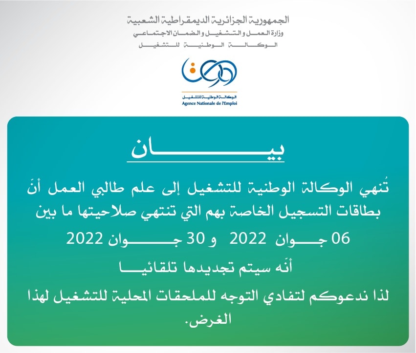 وأوضحت الوكالة في بيان نشرته عبر حسابها على الفيسبوك أن بطاقات التسجيل الخاصة بطالبي العمل لدى مكاتبها تنتهي صلاحيتها بين 06 جوان و30 جوان 2022. وسيتم تجديدها تلقائيا دون الحاجة إلى التنقل إلى وكالاتها.