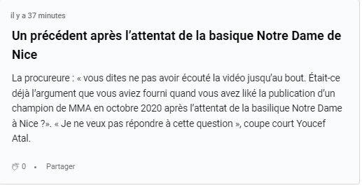 وقالت: “أنت تقول إنك لم تسمع الفيديو إلى نهايته، هل كانت هذه هي الحجة التي قدمتها، حينما قمت بالإعجاب بمنشور أحد أبطال ” MMA” في أكتور 2020 (تقصد البطل حبيب نورمحمدوف) في هجوم كنيسة نيس”؟.
