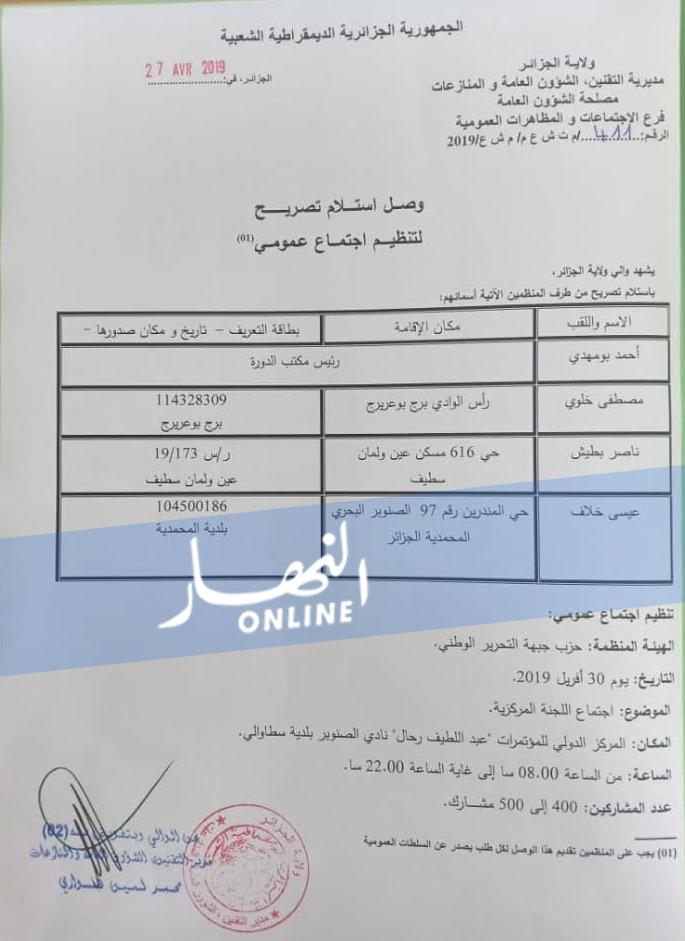 منحت ولاية الجزائر، لحزب جبهة التحرير الوطني، رخصة عقد اجتماع اللجنة المركزية، لانتخاب أمين عام جديد.