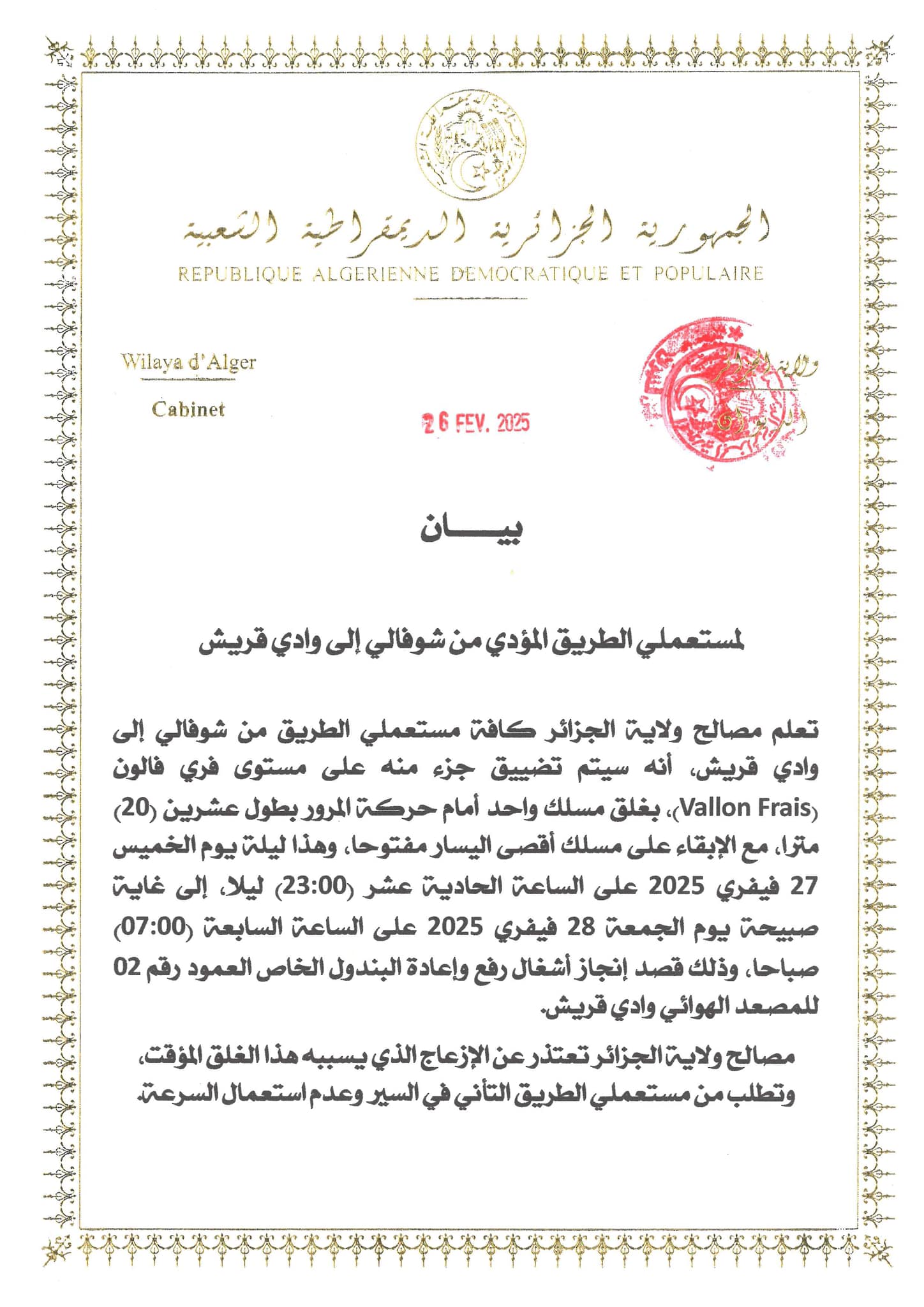 وجاء في البيان: “تعلم مصالح ولاية الجزائر كافة مستعملي الطريق من شوفالي إلى وادي قريش، أنه سيتم تضييق جزء منه على مستوى فري فالون (Frais Vallon)، بغلق مسلك واحد أمام حركة المرور بطول عشرين (20) مترا، مع الإبقاء على مسلك أقصى اليسار مفتوحا”.