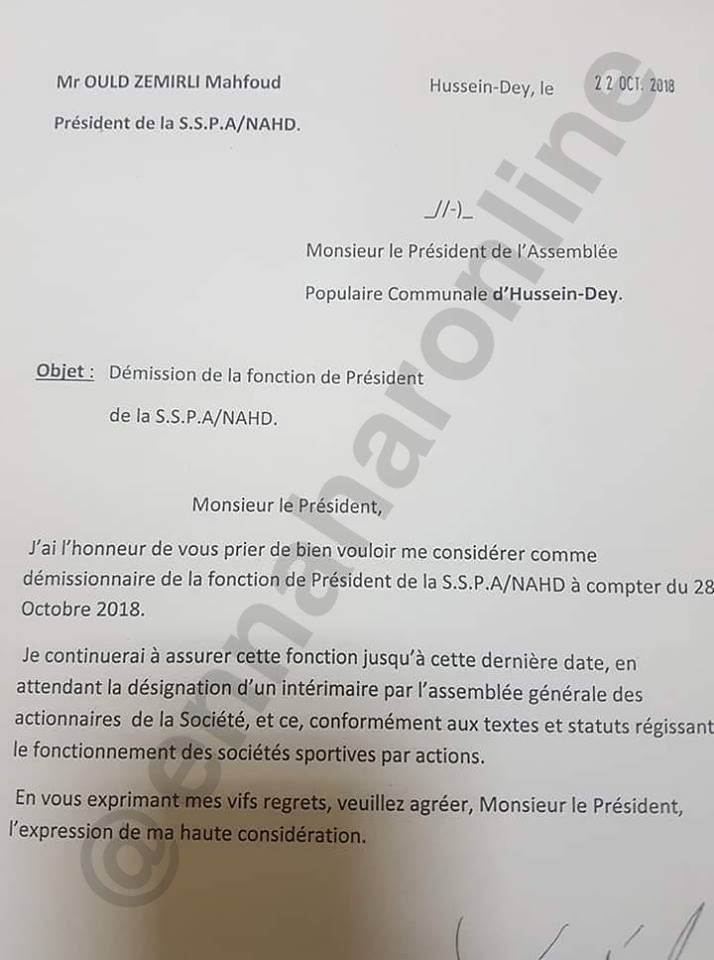 رسّم بشير ولد زميرلي، إستقالته من رئاسة نادي نصر حسين داي، وأعلم مجلس الإدارة بأن مهامه تنتهي بداية من الأحد القادم.