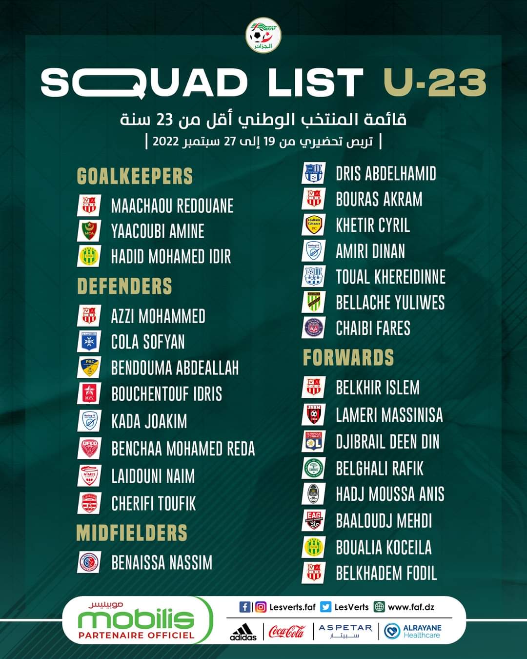 كما سيدوم التربص التحضريري 8 أيام كاملة من 19 إلى 27 سبتمبر من الشهر الجاري.